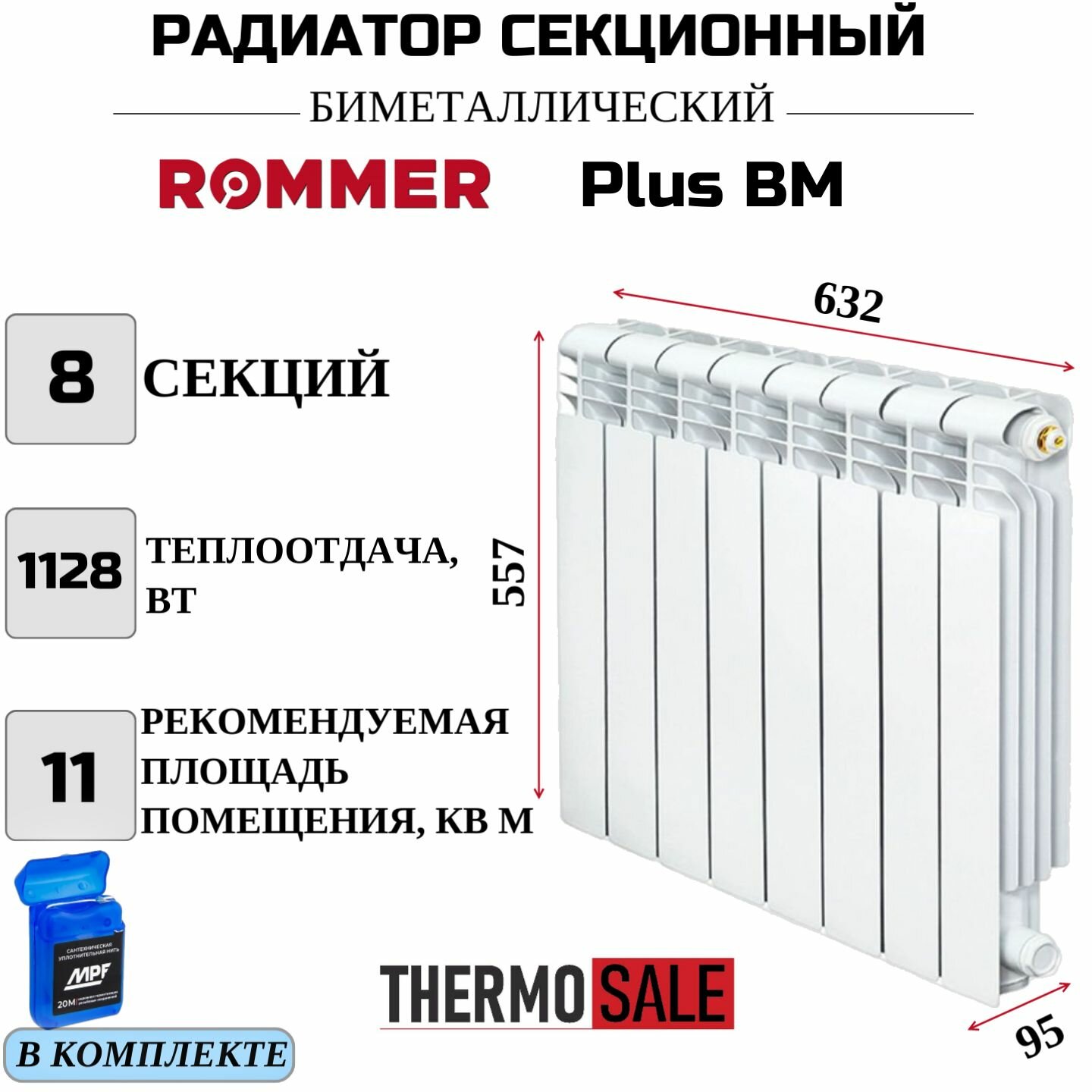 Радиатор секционный биметаллический Plus BM 500 8 секций параметры 557х632х95 боковое подключение Сантехническая нить 20 м