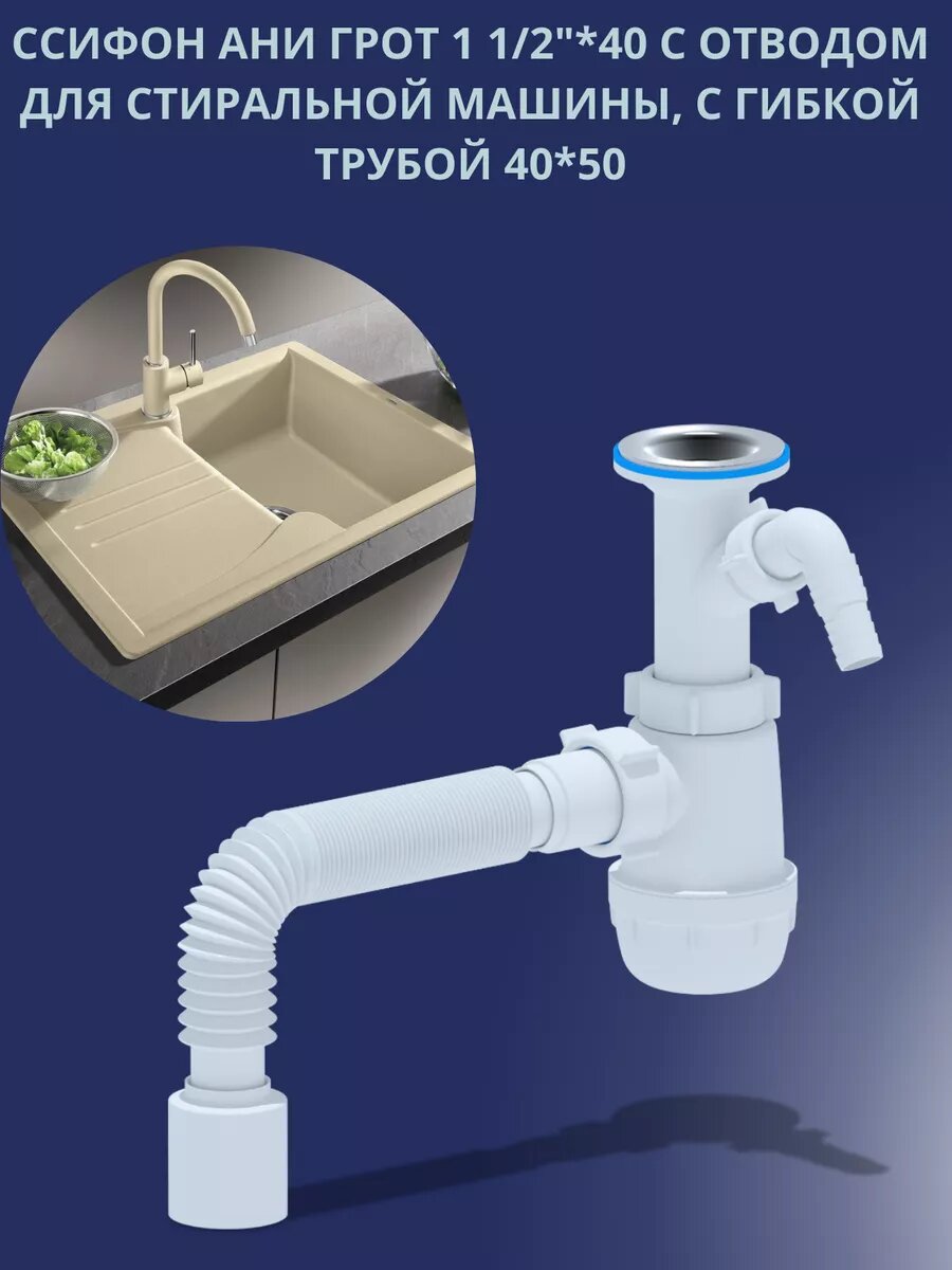 Сифон для кухонной мойки АНИ пласт A2010, 1 1/2"х40 с литым выпуском, отводом для бытовой техники, с гибкой трубой 40/50 мм