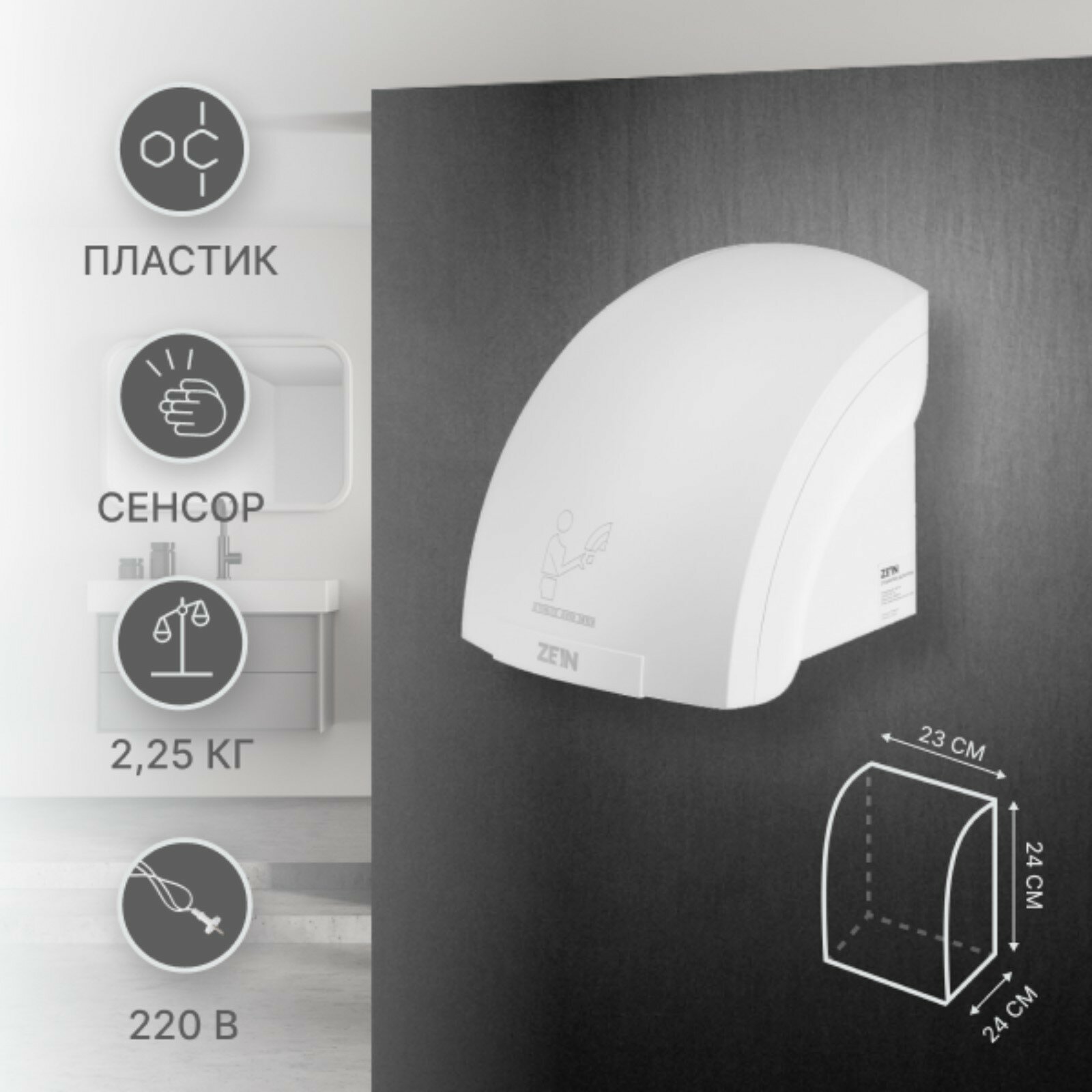 Сушилка для рук Zein Hd224, 2 кВт, 240х240х230 мм, белый Zein 7576479 .
