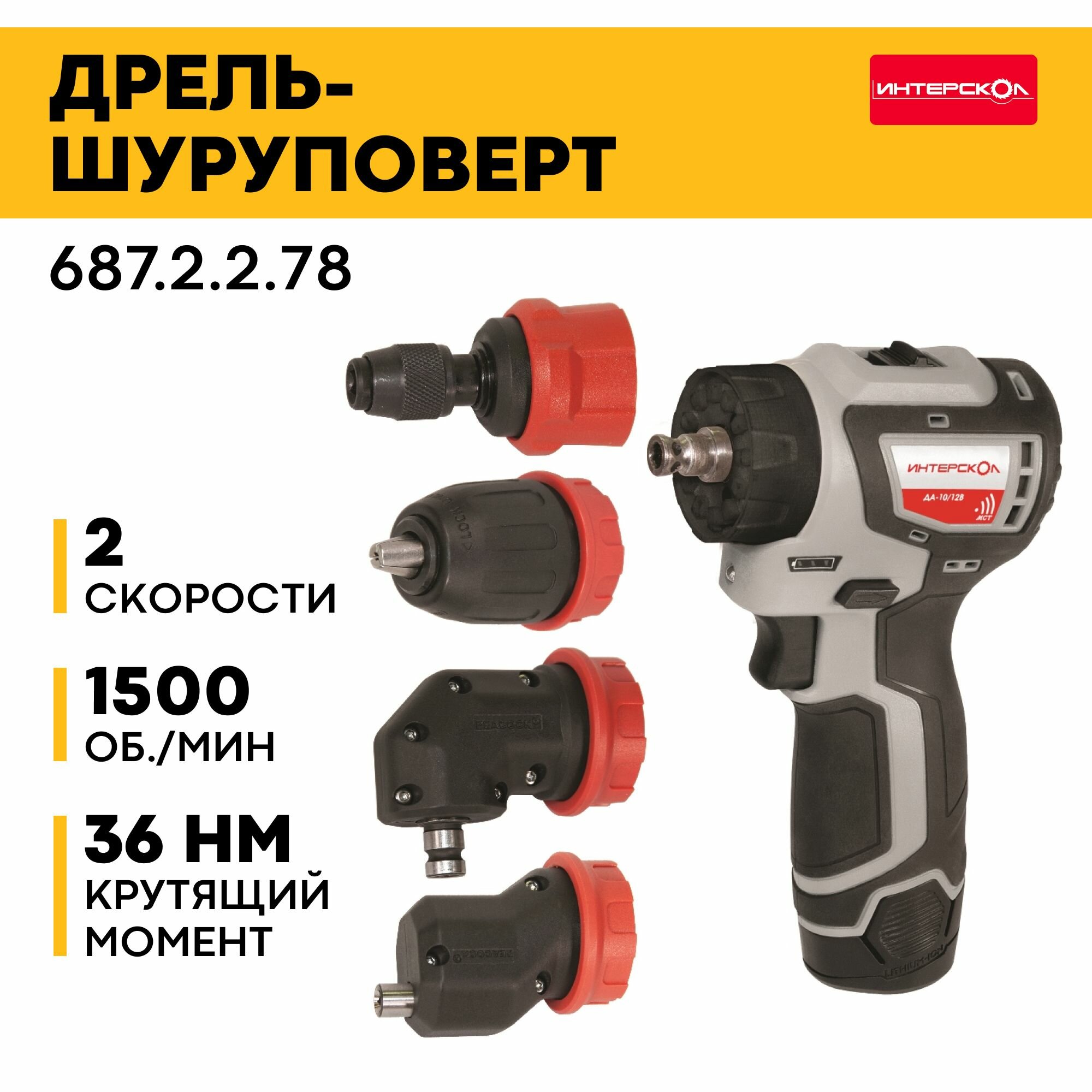 Дрель-шуруповерт аккумуляторная Интерскол ДА-10/12В 36 12В 2Ач Li-Ion 2 АКБ и ЗУ (687.2.2.78)