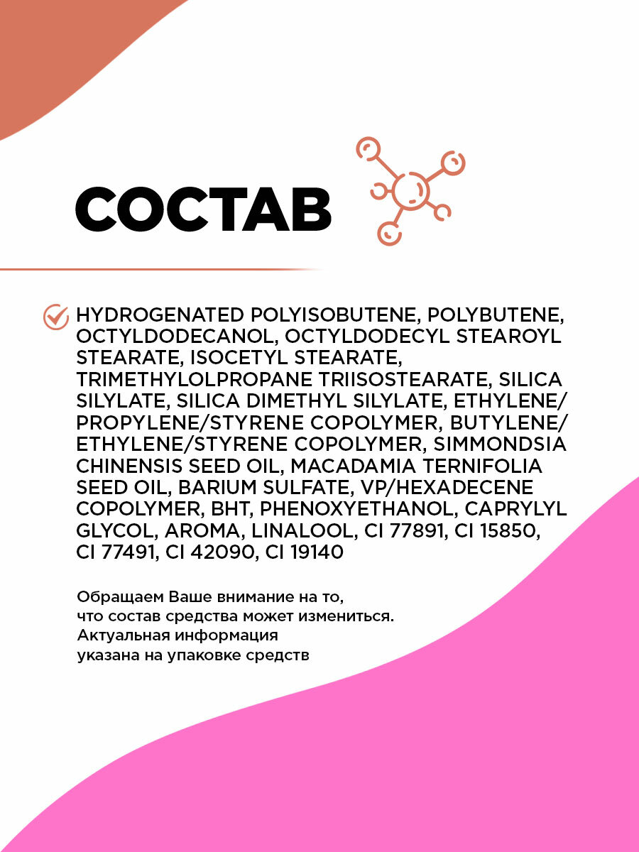 | Цвет товара | 01 мерцающий, 02, 03, 04, 05 коралловый, 06, 07, 08, 09, 10, 11, 12, 13, 14 розово-коричневый, 15 бежево-бордовый |