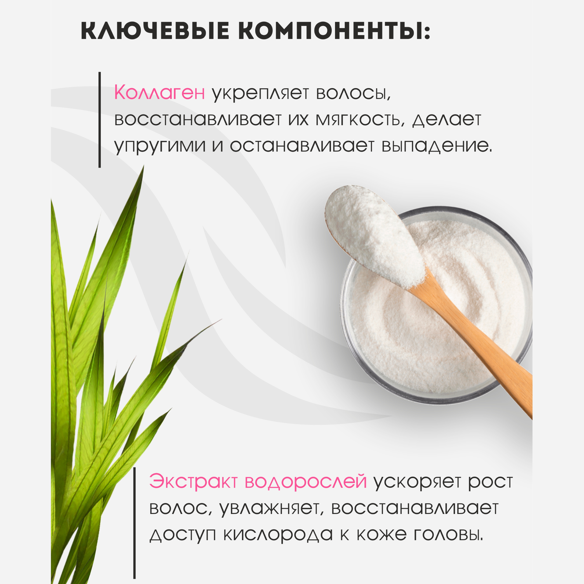 | Активный ингредиент | аргинин / витамин A / витамин B5 / витамин B6 / витамин C / витамин D / витамин E / витамин F / гиалуроновая кислота / гидролизованный шелк / глина / глицерин / глицин / керамиды / кератин / кокосовое молоко / коллаген / кукурузный крахмал / ментол / морские водоросли / пантенол / пептиды / протеины / протеины пшеницы / протеины шелка / салициловая кислота / цетримониум хлорид |