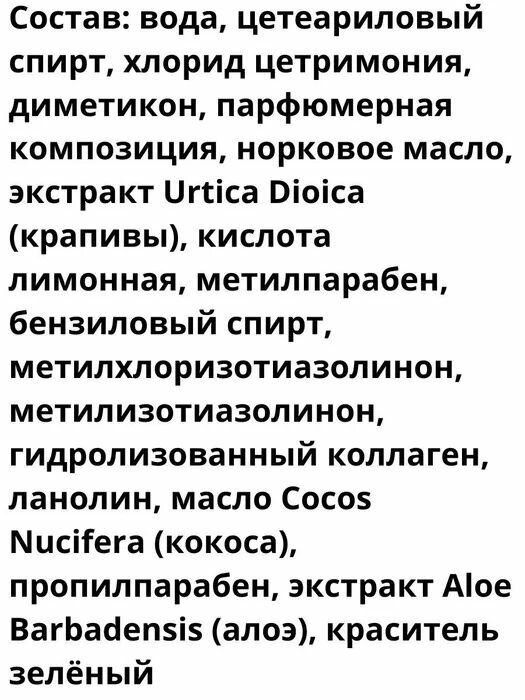 | Состав | вода, цетеариловый спирт, хлорид цетримония, диметикон, парфюмерная композиция, норковое масло, экстракт Urtica Dioica (крапивы), кислота лимонная, метилпарабен, бензиловый спирт, метилхлоризотиазолинон, метилизотиазолинон, гидролизованный коллаген, ланолин, масло Cocos Nucifera (кокоса), пропилпарабен, экстракт Aloe Barbadensis (алоэ), краситель зелёный |