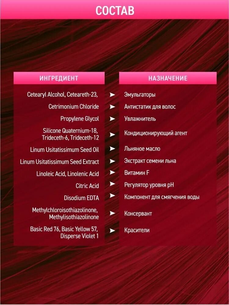 | Состав | aquaCetearyl AlcoholPropylene Glycol, Laureth-11Cocamide DEA, Glyceryl Palmitate/StearatePEG-75 Lanolin, Cetrimonium ChlorideCera Alba, Sodium Lauryl SulfateLinum Usitatissimum Seed ExtractLinoleic Acid, Linolenic AcidCitric Acid, Disodium EDTAMethylchloroisothiazolinoneMethylisothiazolinoneParfum, HC Blue No 15Disperse Violet 1 |