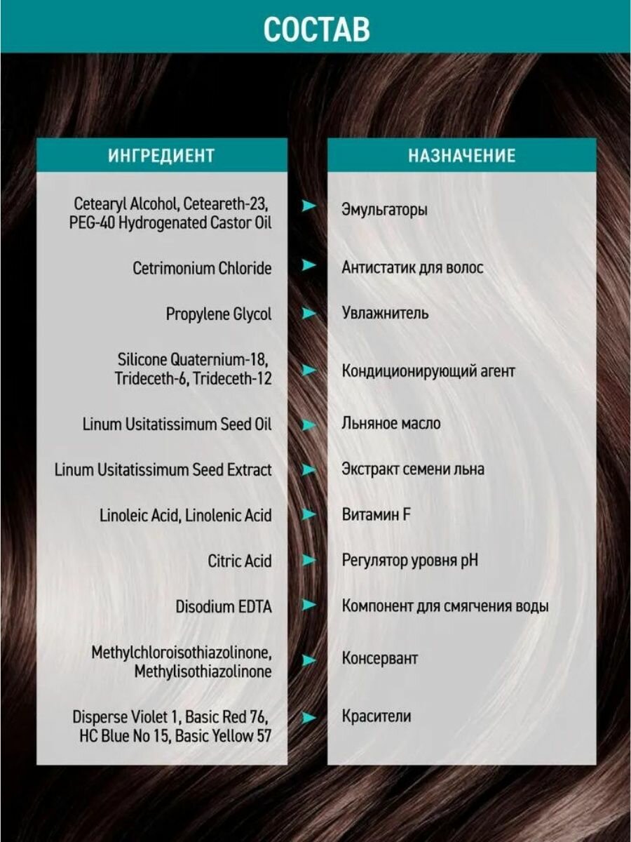 | Состав | Aqua, Cetearyl Alcohol, Propylene Glycol, Ceteareth-23, Cetrimonium Chloride, Linum Usitatissimum Seed Oil, Linum Usitatissimum Seed Extract, Disodium EDTA, Citric Acid, Methylchloroisothiazolinone, Methylisothiazolinone, Parfum, Basic Yellow 57, Basic Blue 99, Basic Red 76 |