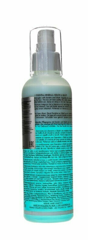 | Состав | aqua (water), cyclopentasiloxane, peg-12 dimethicone, lactic acid, cetrimonium chloride, phenyl trimethicone, sodium benzoate, polyquaternium-4, hydrolyzed keratin, dimethiconol, benzophenone-4, parfum (fragrance), propylene glycol, polysilicone-18 cetyl phosphate, phenoxyethanol, potassium sorbate, saccharomyces/magnesium ferment, ci 42090 (blue 1), saccharomyces/iron ferment, saccharomyces/zinc ferment, saccharomyces/copper ferment, saccharomyces/silicon ferment, hexyl cinnamal, limonene, linalool |