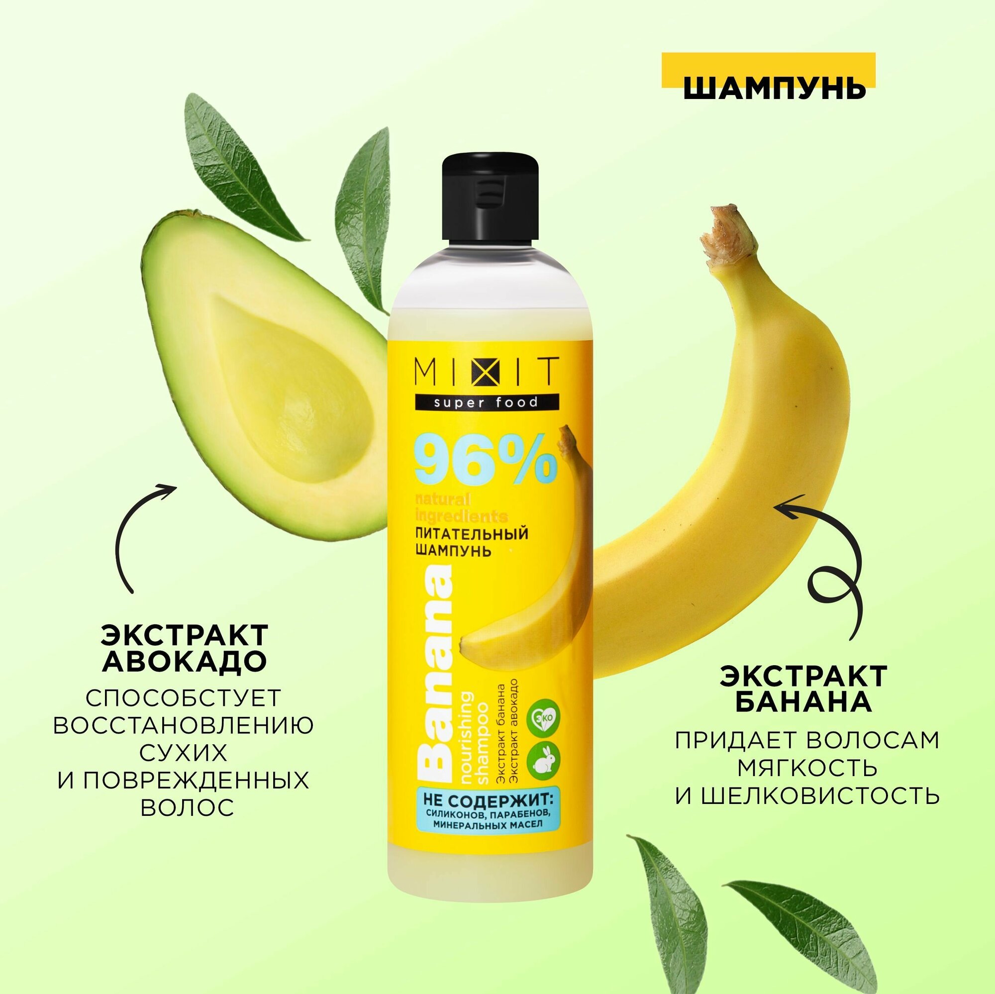 MIXIT Питательный шампунь для волос с экстрактом aвокадо и банана для восстановления SUPER FOOD, 400 мл