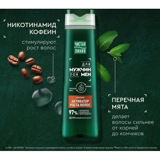 Чистая линия шампунь мужской для активации роста волос с перечной мятой и кофеином, 400 мл
