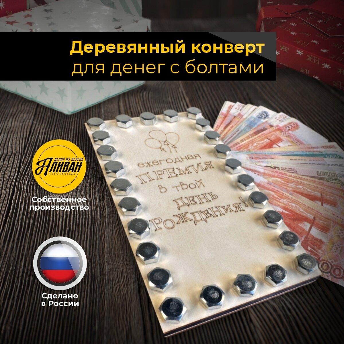 Купить Конверт для денег деревянный подарочный с болтами на день рождения