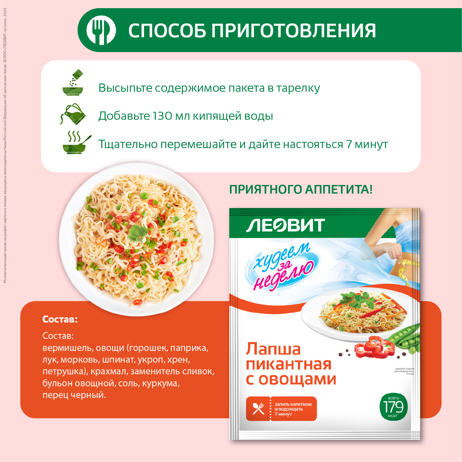 Лапша пикантная с овощами Худеем за неделю, 12 шт по 40 г, леовит интересное: