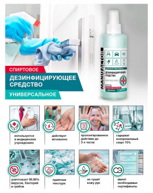 Антисептик для рук и поверхностей спиртосодержащий (70%) с распылителем 100 мл MANUFACTOR, дезинфицирующий, жидкость, N30913 (цена за 1 ед.товара)