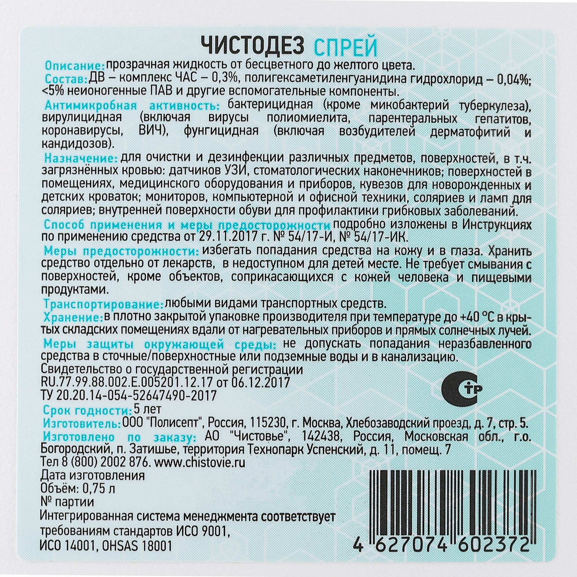Чистодез спрей для быстрой дезинфекции Чистовье (Полисепт), 750 мл интересное: