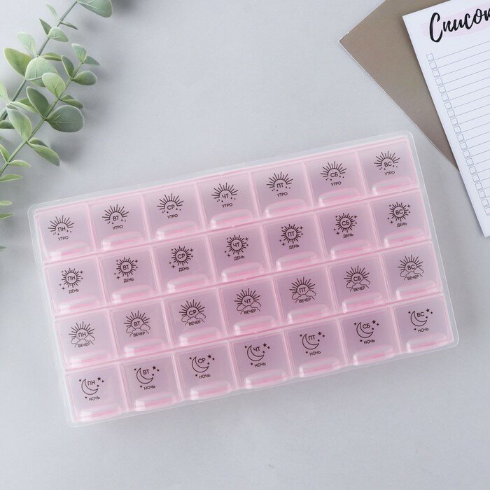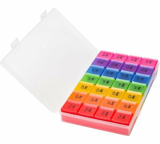 Купить Таблетница 28 секций 7 отделений (на каждый день недели) по 4 секции (утро, вечер, день, ночь), размер 10х18 см