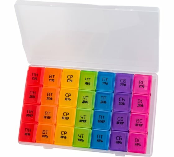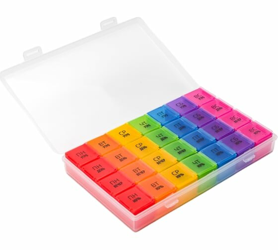 Таблетница 28 секций 7 отделений (на каждый день недели) по 4 секции (утро, вечер, день, ночь), размер 10х18 см интересное:
