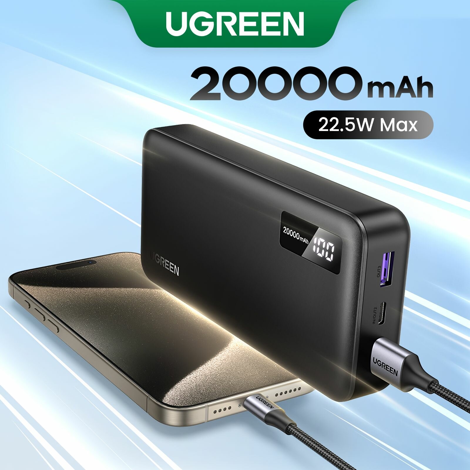 Внешний аккумулятор Ugreen PB312, 20000 мАч, 2 выхода, быстрая зарядка