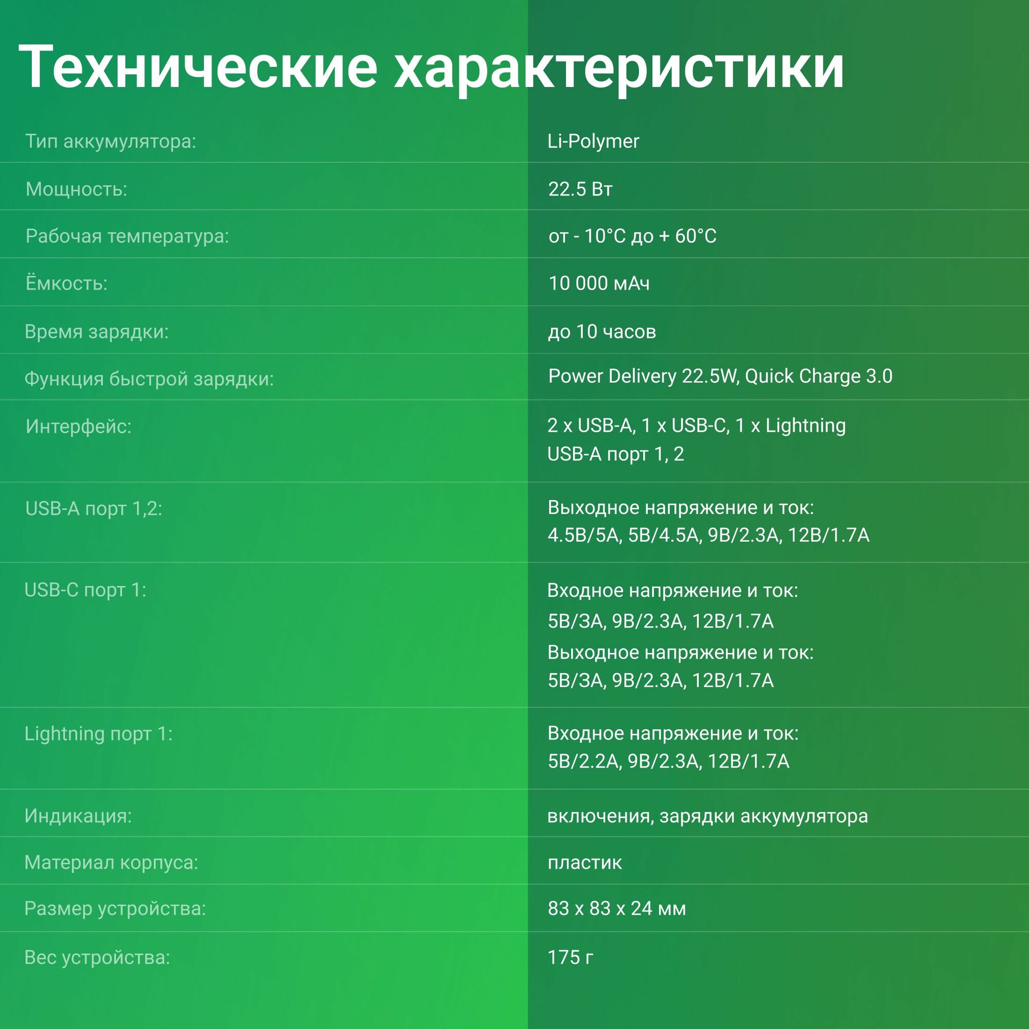 | Особенности | зарядка двух устройств / индикатор заряда |