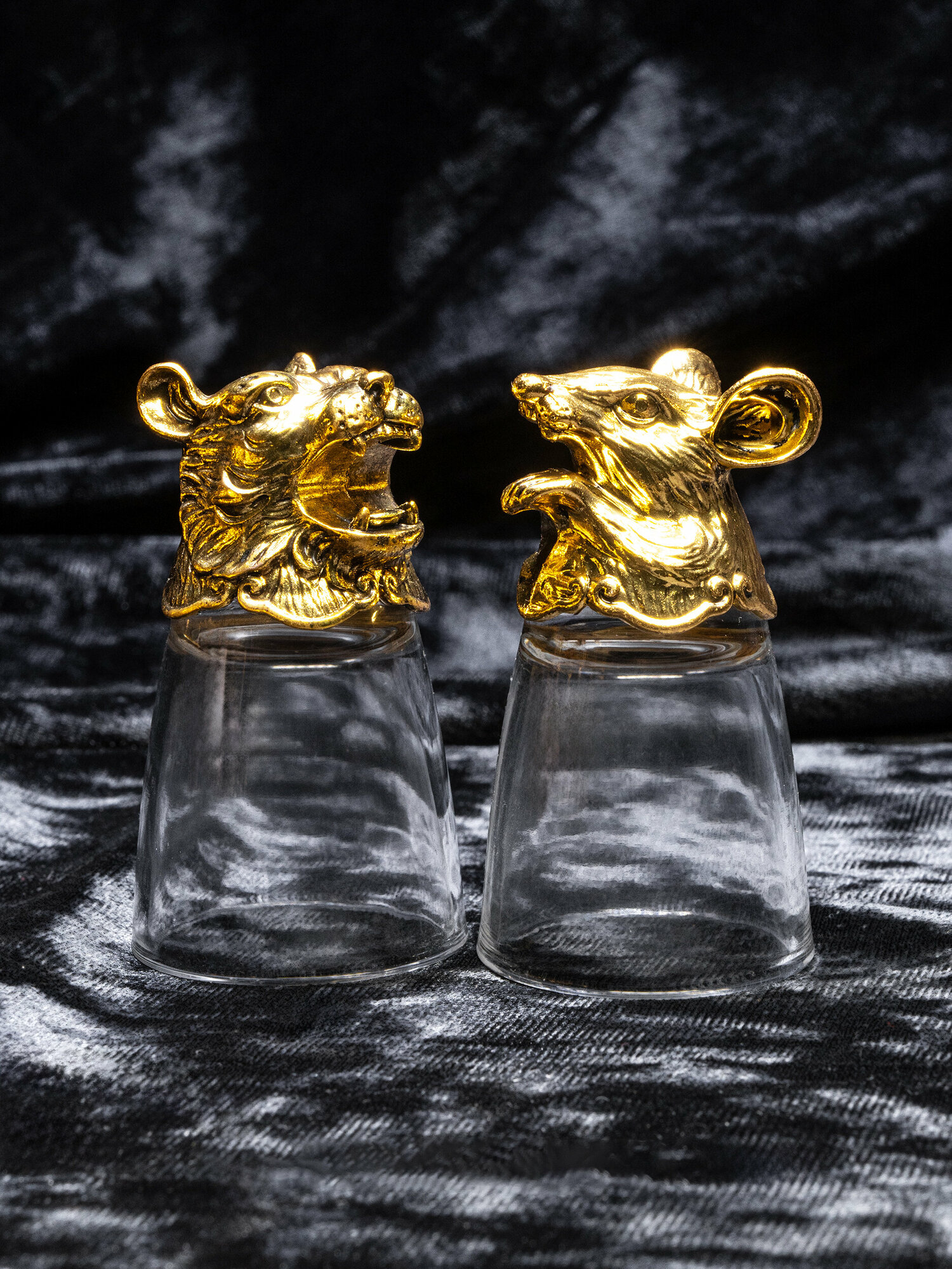 Рюмки-перевертыши с подставкой из латуни, стекла и металла 12 штук, 30мл