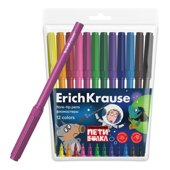 Купить Фломастеры 12цв ErichKrause Приключения Пети и Волка, в футляре, европодвес 10387035