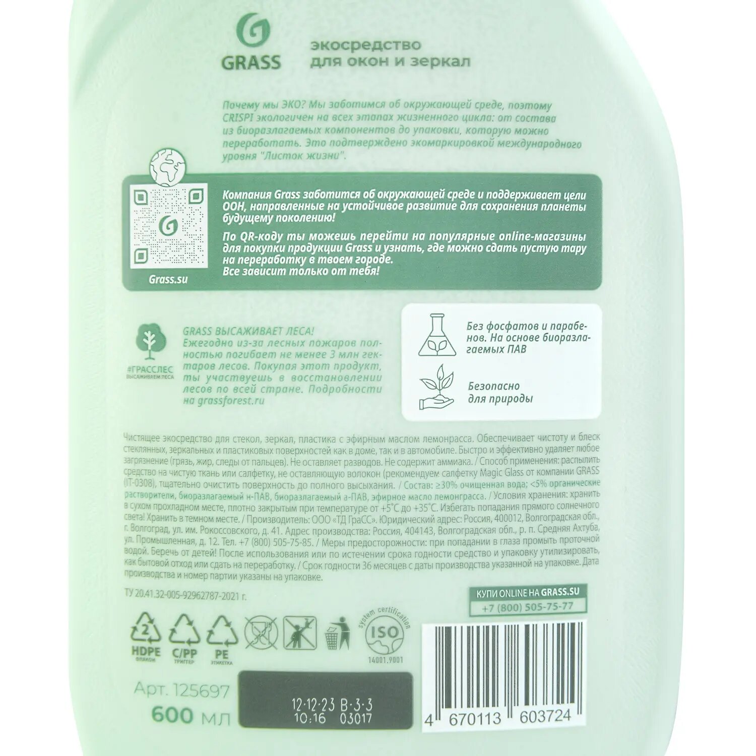 Жидкость Grass ECO Crispi для мытья стёкол, окон, пластика и зеркал, 600 г, 600 мл