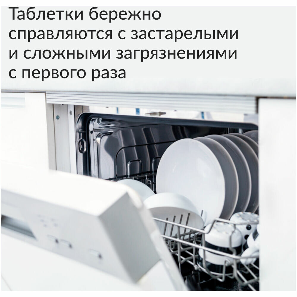 | Способ применения | удалите с посуды остатки пищи и положите посуду в ПММ согласно инструкции производителя Вашей машины. Предварительно сняв защитную пленку, положите одну или две таблетки в отсек для моющего средства (или прямо внутрь машины) и запустите программу мойки. Рекомендуется использовать на режиме «ЭКО» или при температуре 45-50°С. Не рекомендуется использовать таблетки на коротких программах мойки. Не рекомендуется использовать для алюминиевой, серебряной, мельхиоровой посуды, а также посуды с ручной росписью. При жёсткой воде обязательно применять соль для посудомоечной машины, в соответствии с рекомендациями производителей машин. |