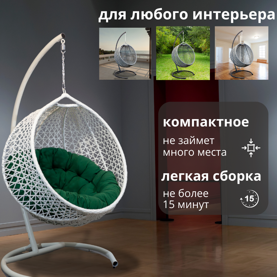 Подвесное кресло кокон, 110*78*100, снежка, белый,зеленая подушка интересное: