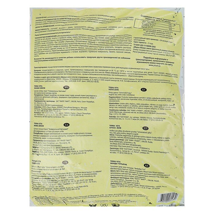 | Состав | Грунт Terra Vita Живая земля универсальный цветочный, 25 л, 6.5 кг |