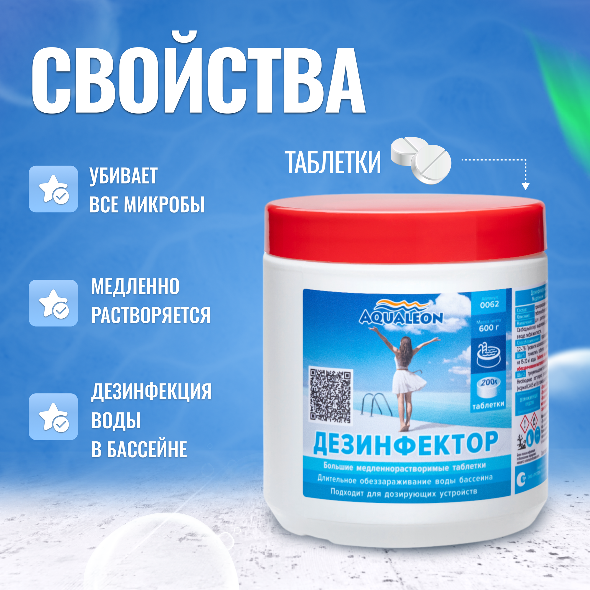 | Дополнительная информация | Таблетки без капсулы или скиммера в бассейн не бросать – опасность обесцвечивания материалов бассейна! |