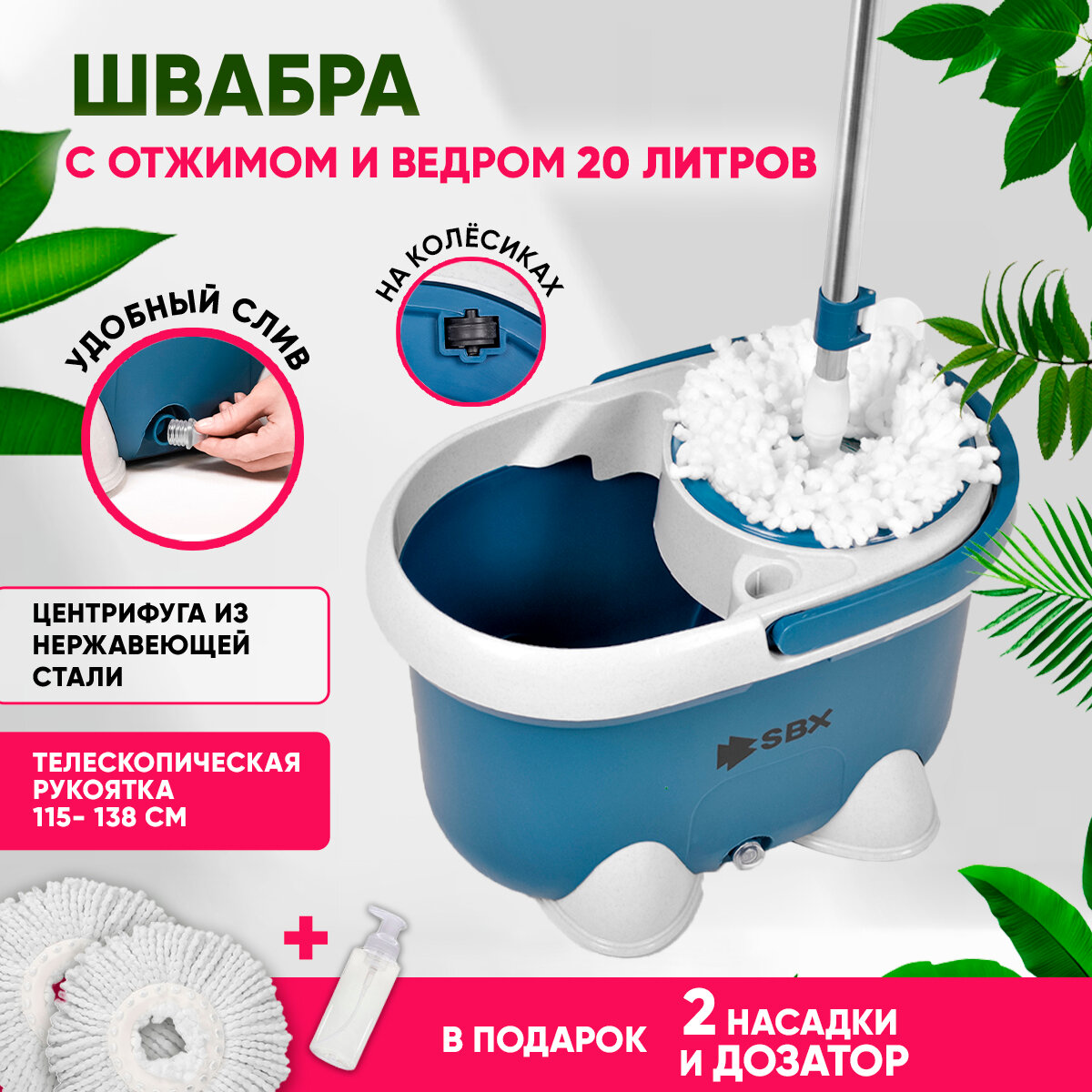 Швабра SBX-21 с отжимом и ведром 20 л, комплект для уборки и мытья пола с насадкой из микрофибры, темно-синий. Насадка-2 шт интересное: