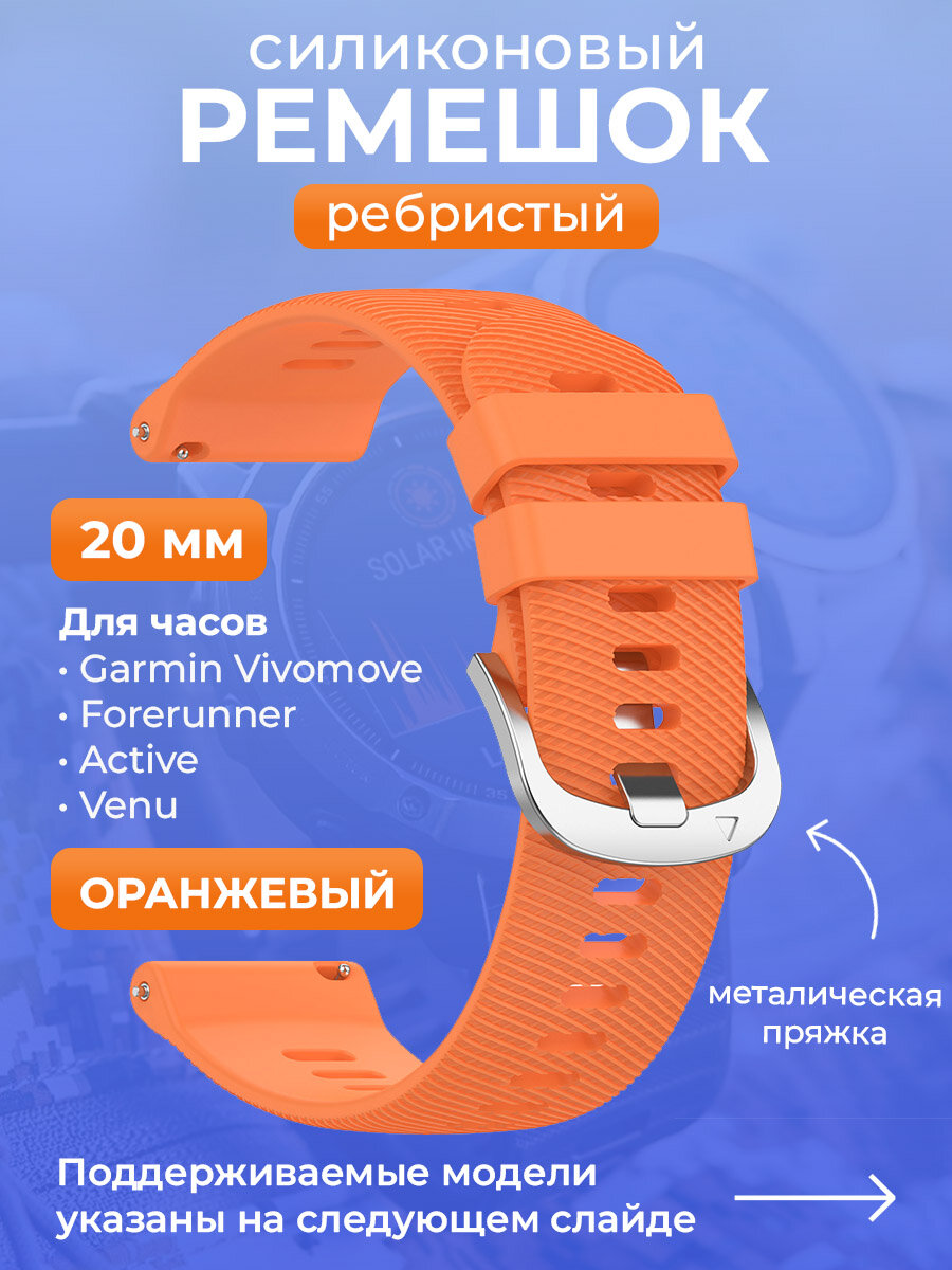 СохранитьСиликоновый ремешок для Garmin Vivomove / Forerunner / Active / Venu, 20 мм, ребристый, cеребристая пряжка, оранжевый интересное: