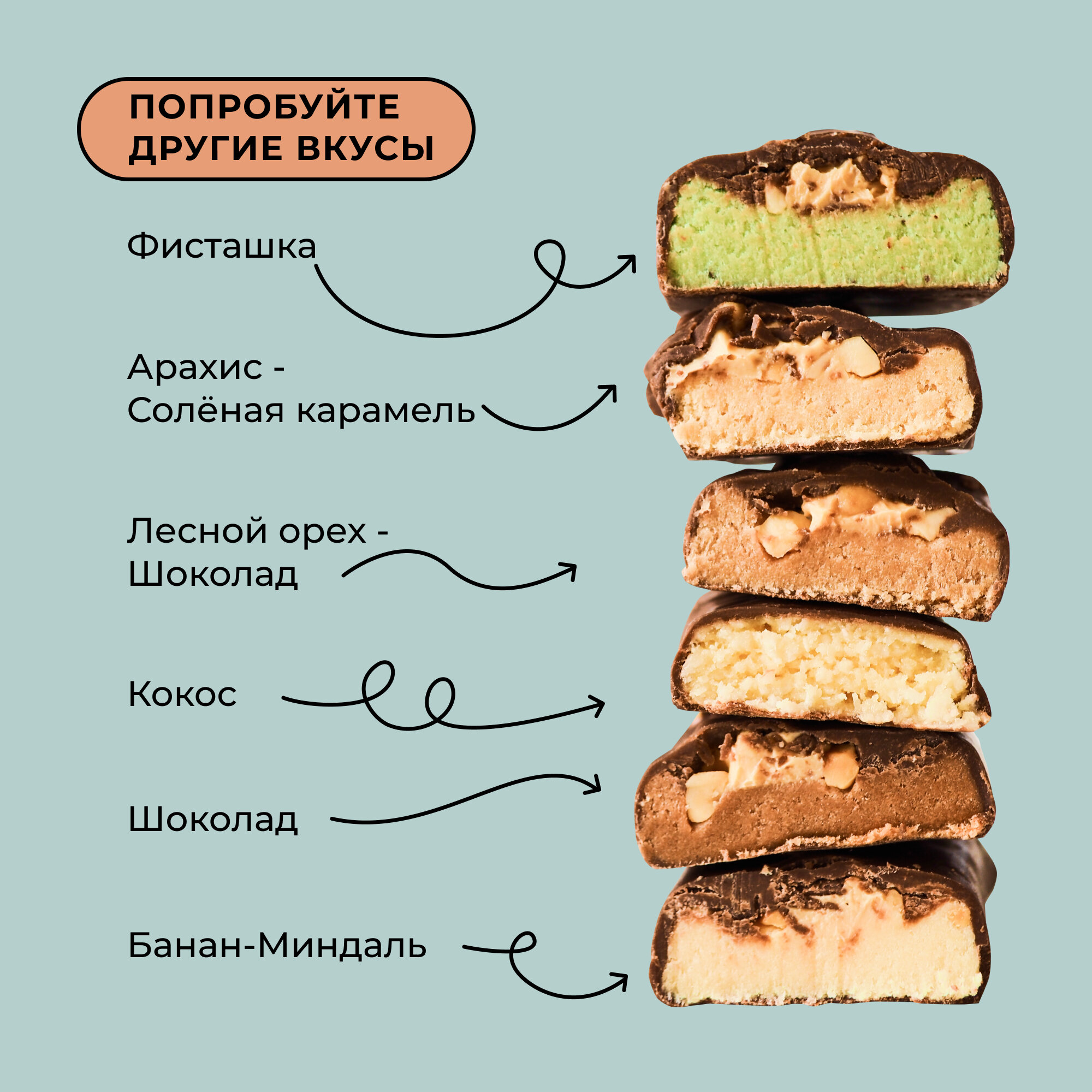 | Вкус | арахис-соленая карамель / ассорти / ассорти 3 вкуса / ассорти всех вкусов / банан-миндаль / капучино / кокос / малина / фисташка / шоколад / шоколад-лесной орех |