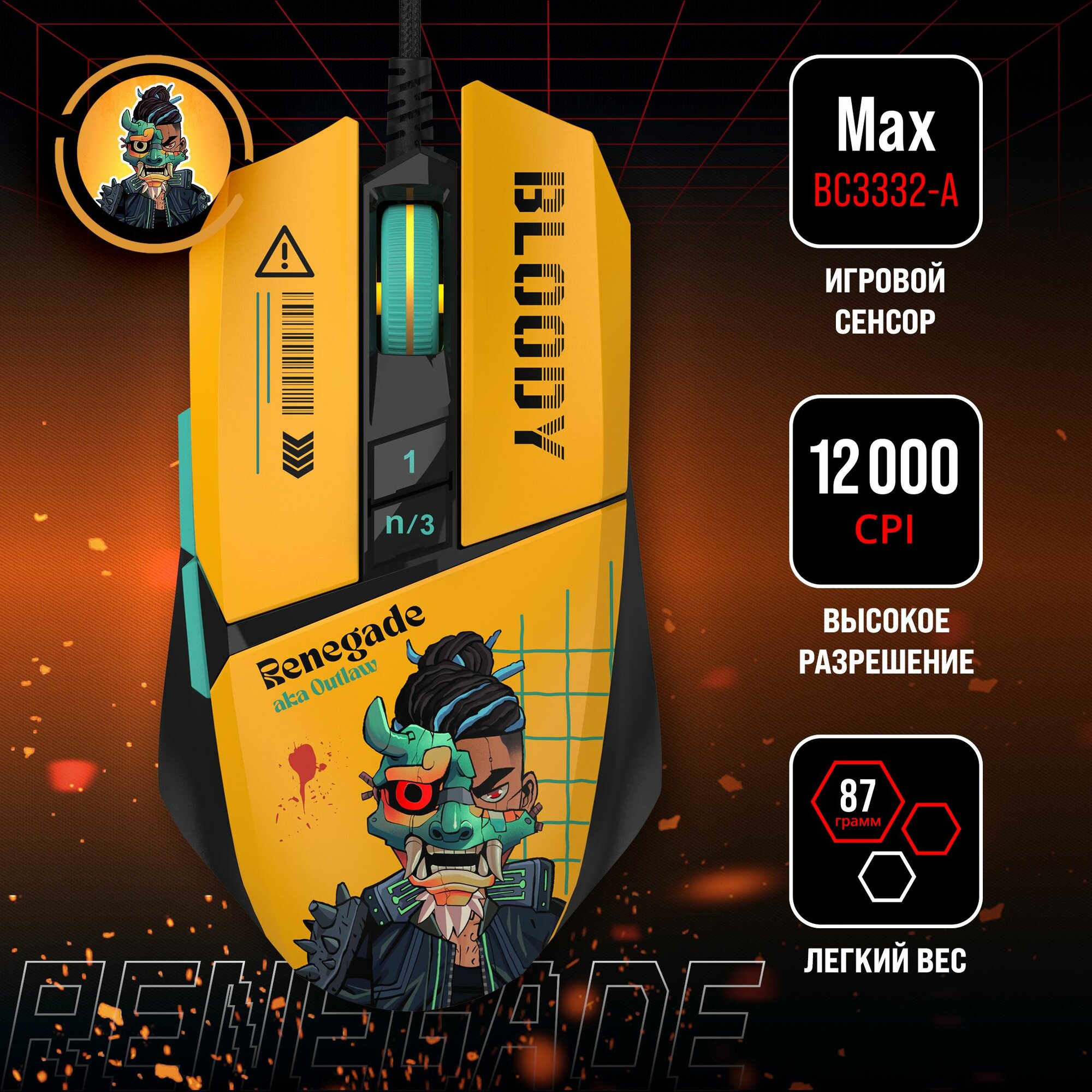Мышь A4TECH Bloody W63 Max Renegade, игровая, оптическая, проводная, желтый и рисунок