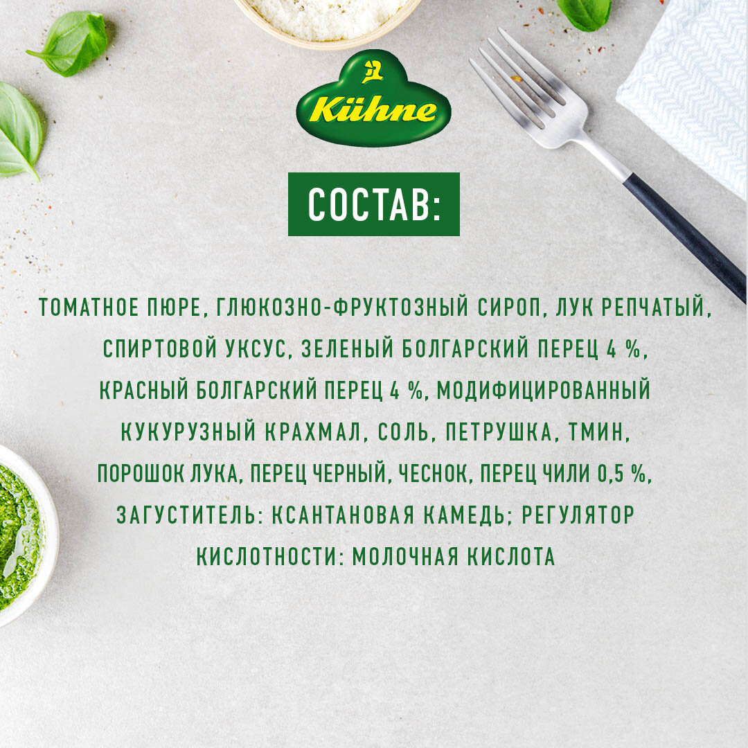 | Состав | томатное пюре, глюкозно-фруктозный сироп, лук репчатый, спиртовой уксус, зеленый болгарский перец 4 %, красный болгарский перец 4 %, модифицированный кукурузный крахмал, соль, петрушка, тмин, порошок лука, перец черный, чеснок, перец чили 0,5 %, загуститель: ксантановая камедь; регулятор кислотности: молочная кислота. |