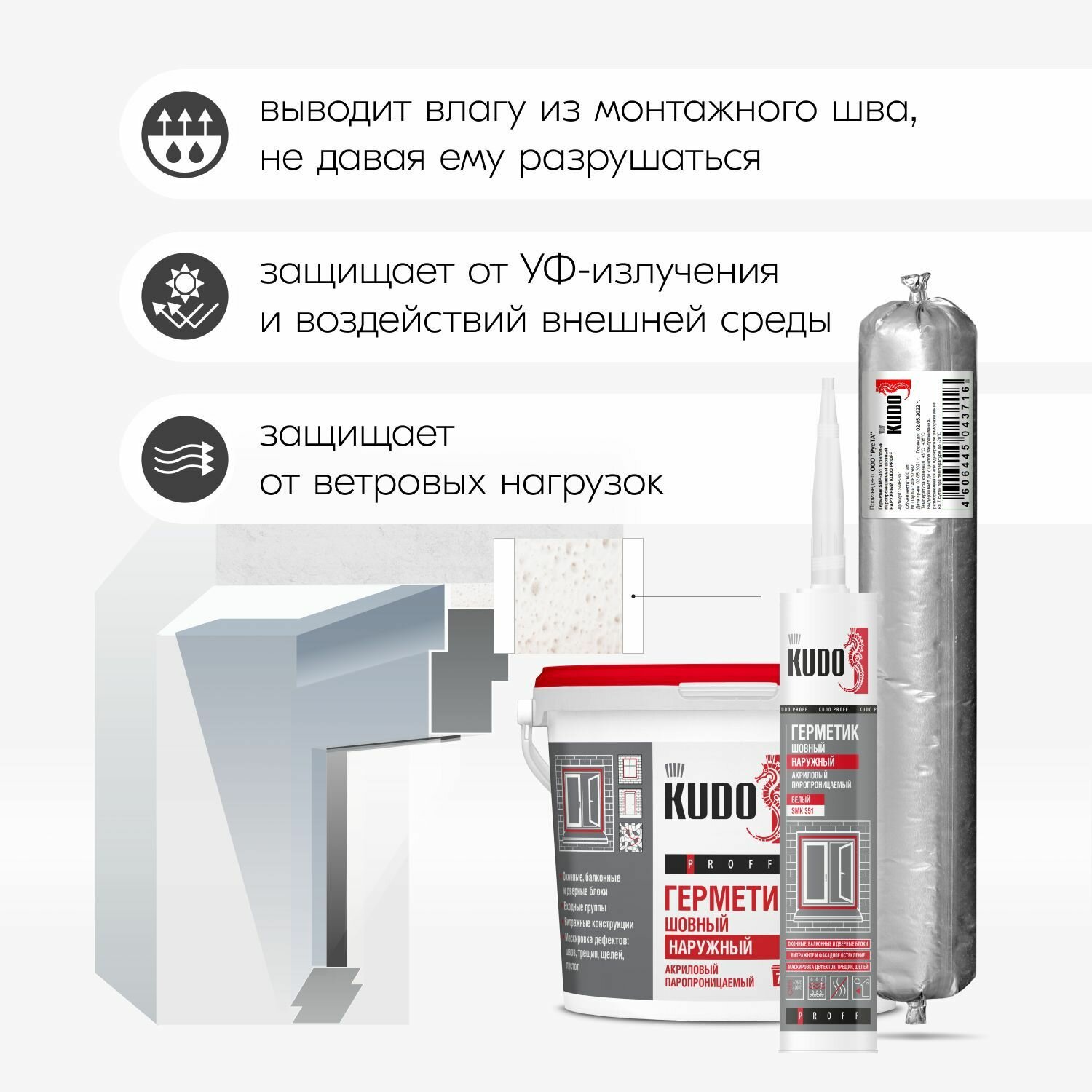 СохранитьГерметик акриловый KUDO PROFF, наружный, паропроницаемый шовный, для монтажной пены при монтаже окон, SMS-351, 7 кг, белый интересное: