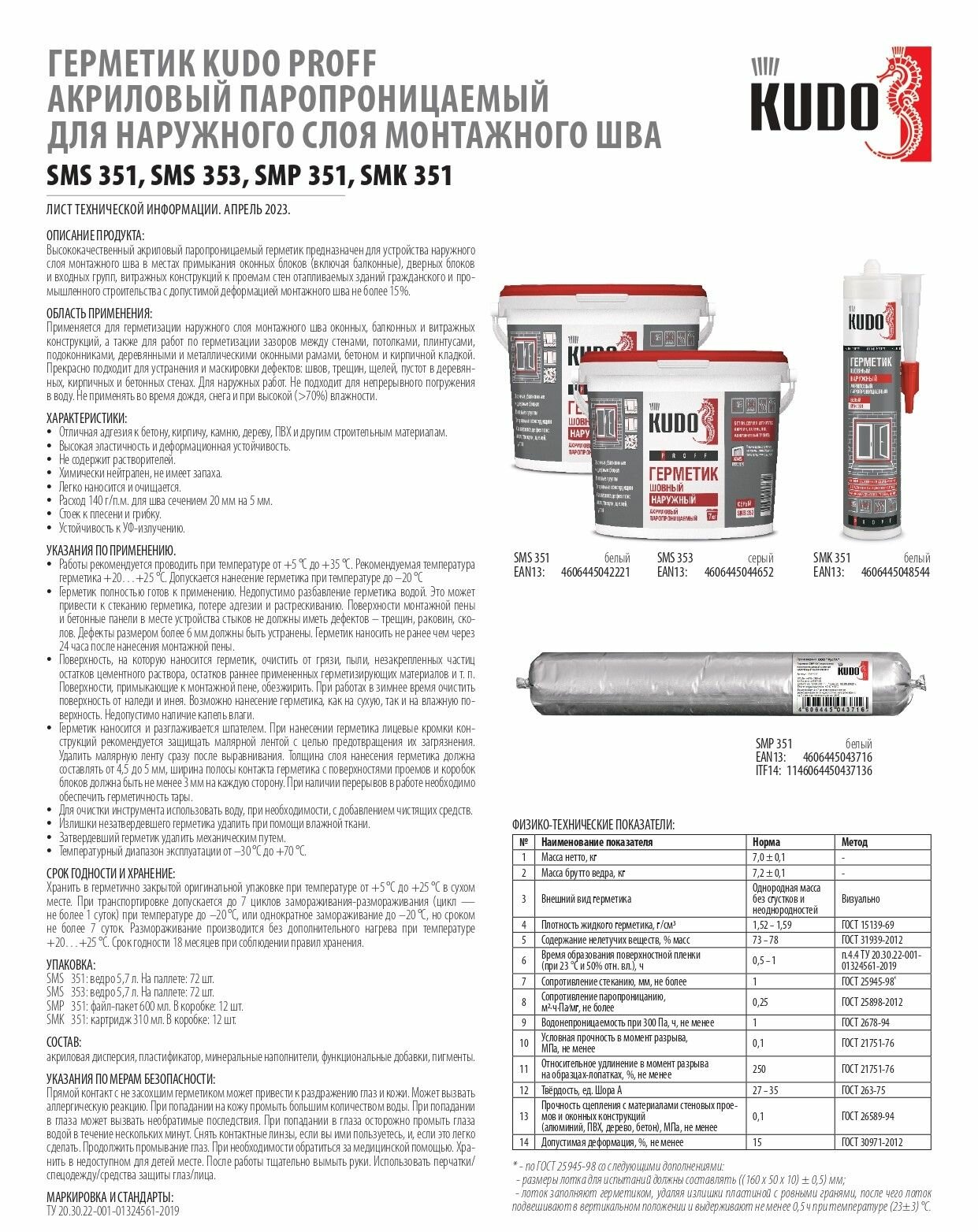 KUDO PROFF SMP-351, Герметик акриловый паропроницаемый шовный наружный , белый,600 мл