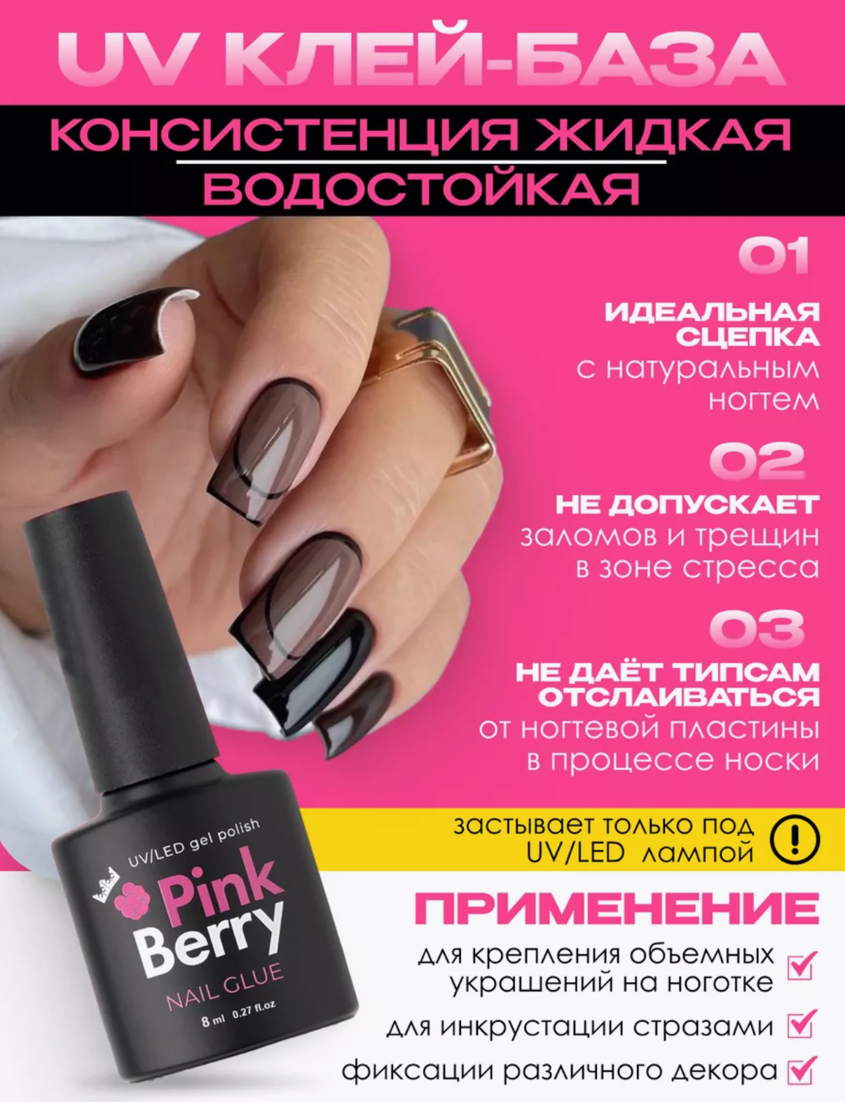 Клей для накладных ногтей и гелевых типс с кисточкой от Pinkberry, объем 8 мл