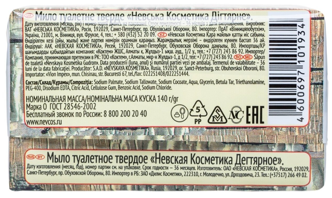 Туалетное мыло, Невская Косметика, дегтярное, 140 г, 4 шт