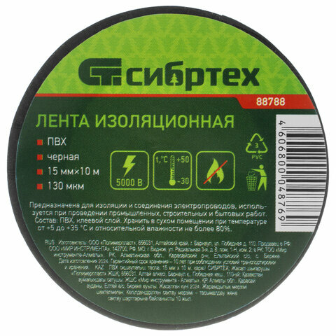 Изолента Сибртех (15мм x 10м, 130мкм, черная) 1шт. (88788)