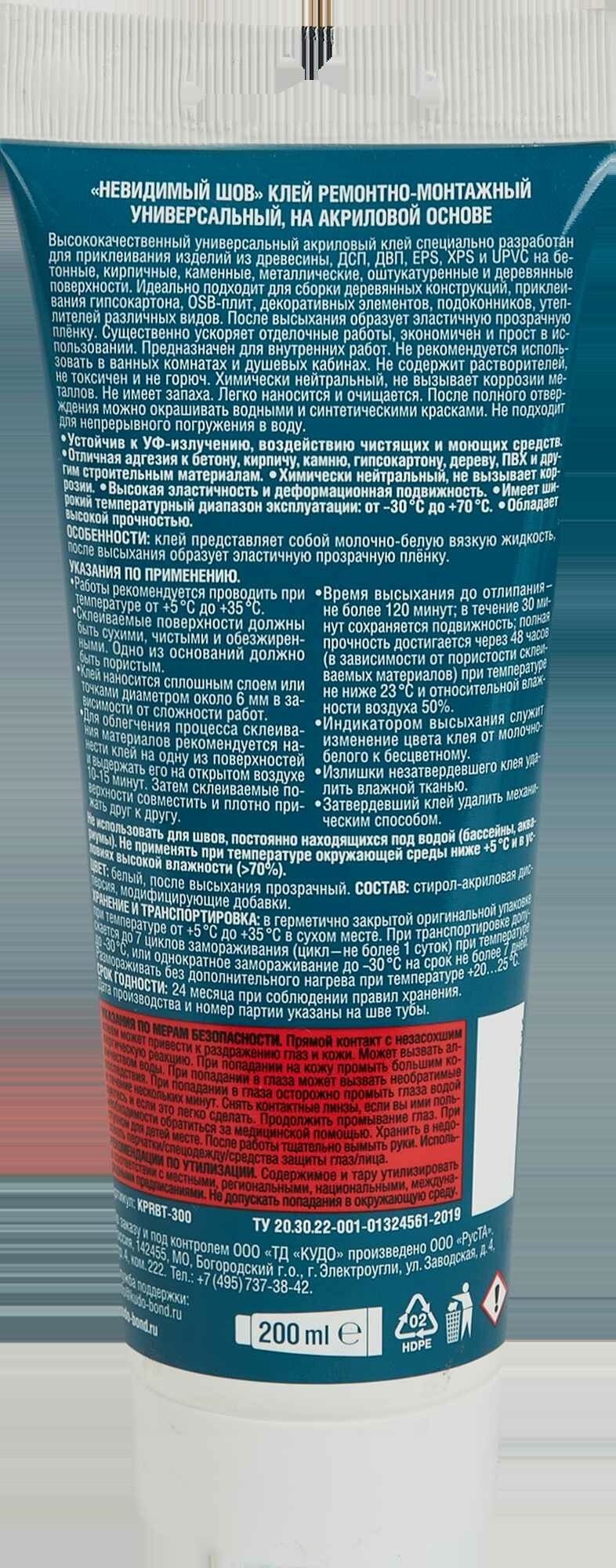 Клей ремонтно-монтажный KUDO «невидимый шов», на акрил. основе KBT 300, прозрач. тюбик 200 мл