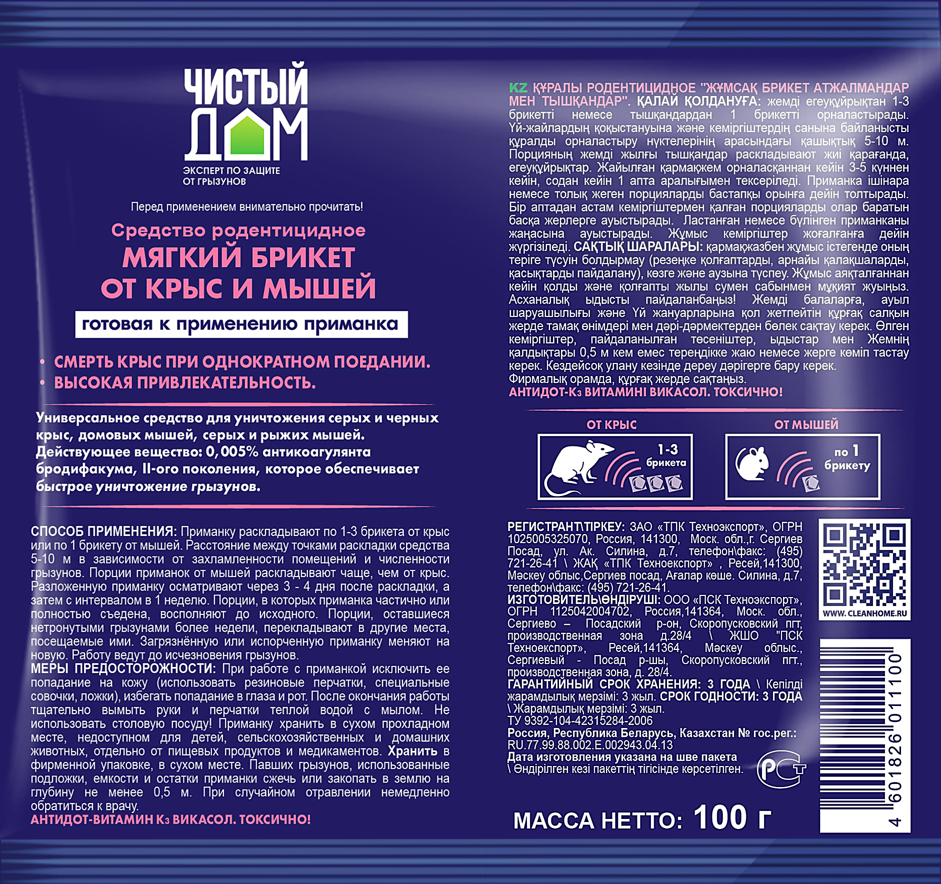 Чистый дом тесто-брикет от крыс и мышей (100 г)