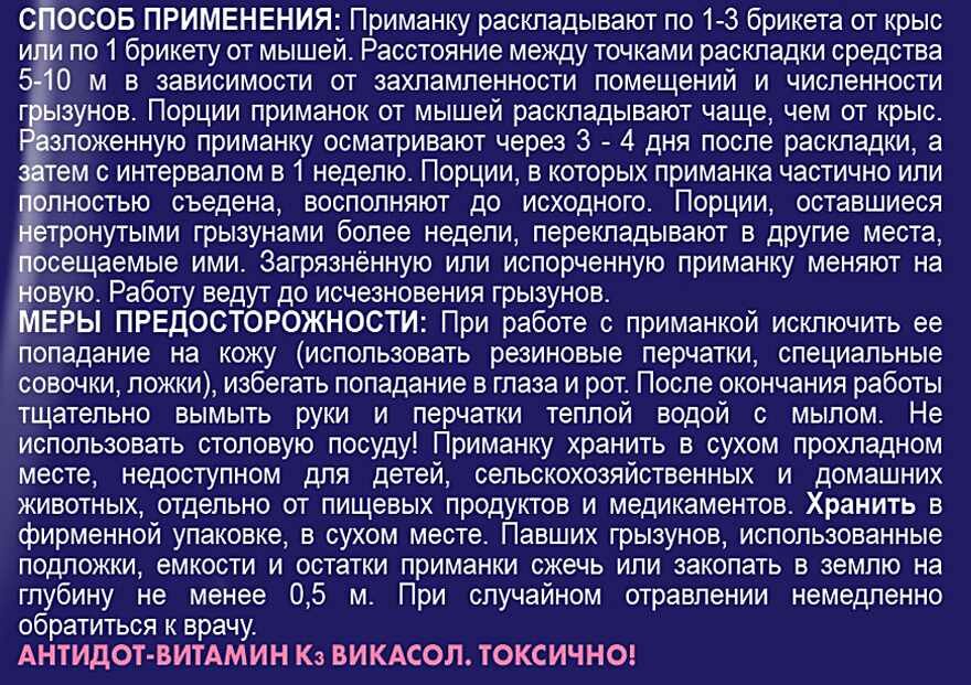 | Дополнительная информация | Меры предосторожности: при работе с приманкой исключить ее попадание на кожу (использовать резиновые перчатки, специальные совочки, ложки), избегать попадания в глаза и рот. После окончания работы тщательно вымыть руки и перчатки теплой водой с мылом. Не использовать столовую посуду! Приманку хранить в сухом прохладном месте, недоступном для детей, сельскохозяйственных и домашних животных, отдельно от пищевых продуктов и медикаментов. Хранить в фирменной упаковке в сухом месте. Павших грызунов, использованные подложки, емкости и остатки приманки сжечь или закопать в землю на глубину не менее 0,5 м. При случайном отравлении немедленно обратиться к врачу. |