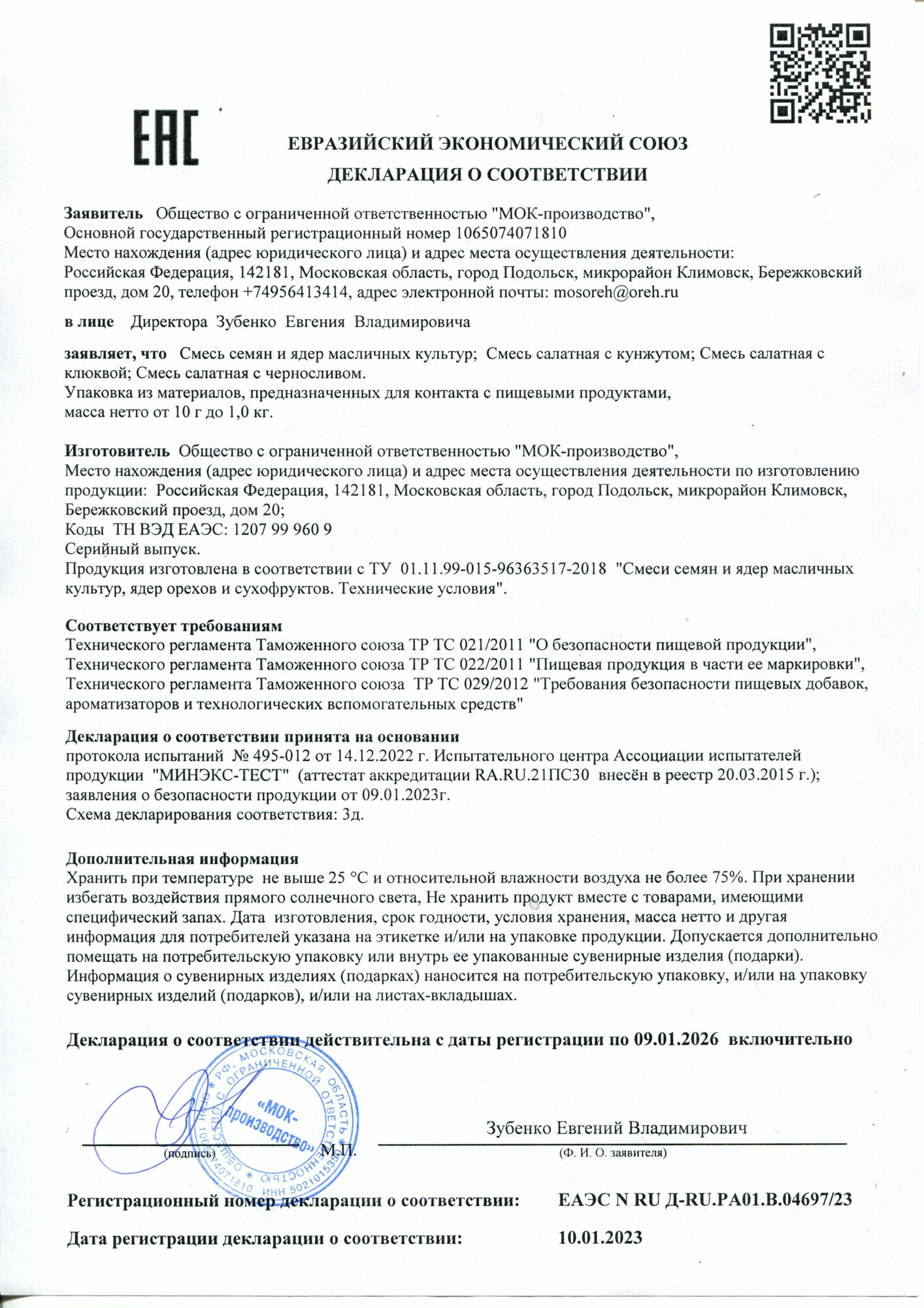 | Состав | чернослив сушеный резаный (чернослив, консервант Е202), ядра семян подсолнечника, ядра семян тыквы, ядра фундука жареные дроблёные. В редких случаях продукт может содержать мелкие фрагменты косточки. |