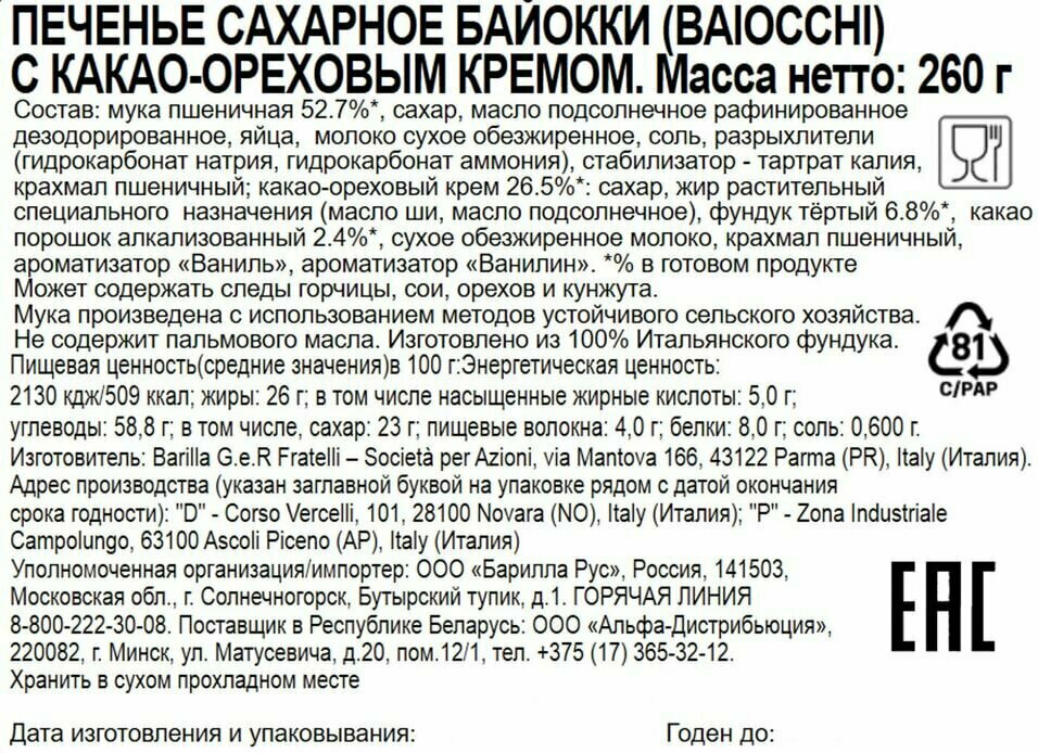 Печенье песочное Barilla "Байокки" с ореховым кремом 260 г интересное: