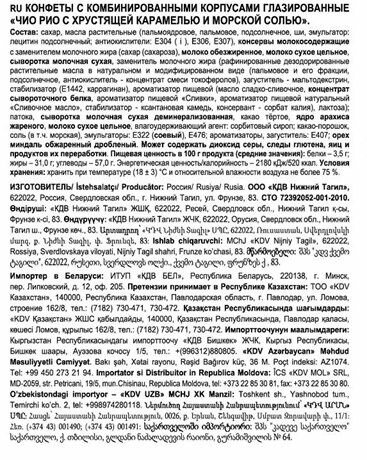 | Состав | сахар, патока, молоко цельное сгущённое с сахаром (молоко цельное, молоко обезжиренное, сахар (сахароза), лактоза); масла растительные, какао-порошок, декстроза, мальтодекстрин, сыворотка молочная сухая деминерализованная, молоко сухое цельное, стабилизатор: гуммиарабик; соль, влагоудерживающий агент: сорбитовый сироп; эмульгатор: Е322 (соевый), какао тёртое, масло какао, ароматизаторы, антиоксиданты: Е304, Е306. Может содержать диоксид серы, следы глютена, яиц, арахиса, орехов и продуктов их переработки. |