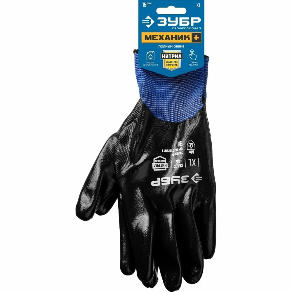 Купить ЗУБР МЕХАНИК+, XL, тонкое нитриловое покрытие, полный облив ладони, маслобензостойкие перчатки, Профессионал (11279-XL)
