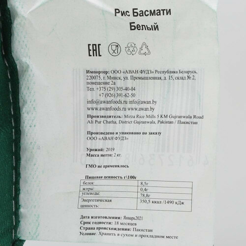 | Состав | Рис Басмати длиннозерный традиционный 100 % |
