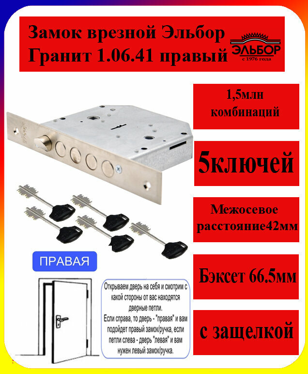 Замок врезной сувальдный с задвижкой и защёлкой Эльбор Гранит 1.06.41 (правый), 5 кл. /00446/