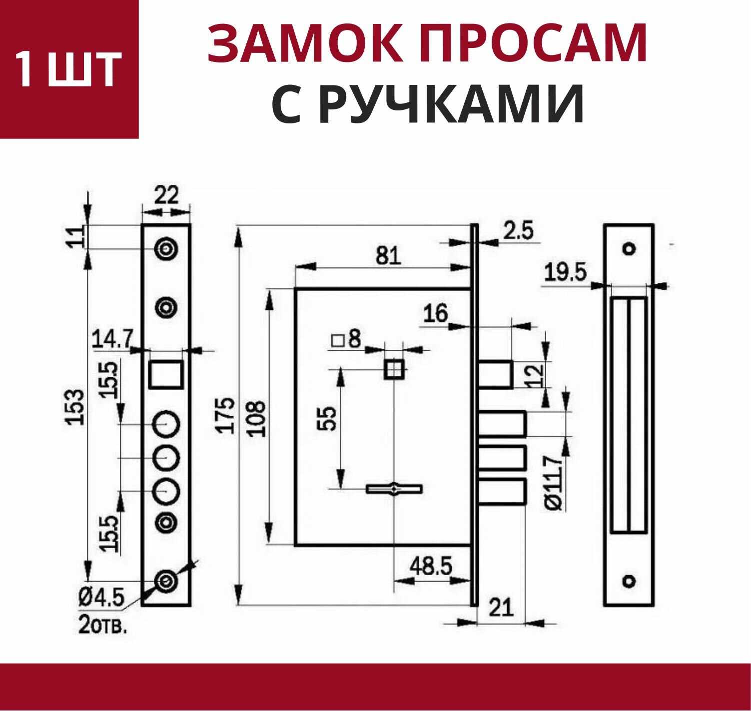 Врезной Замок с ручками ПРО-САМ 76704 3 сувальдные ключа, черный муар
