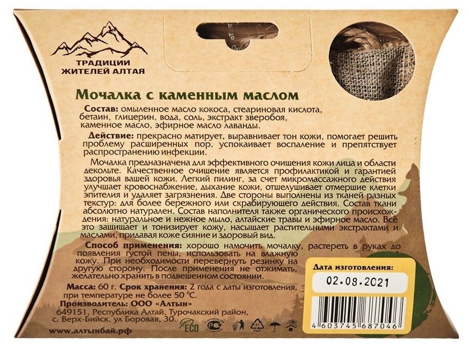 Мочалка для умывания С каменным маслом, Алтын Бай, 60 гр.