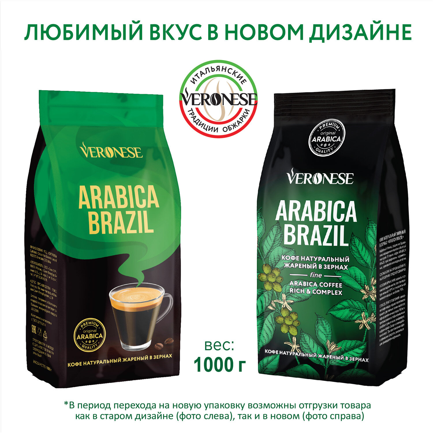 Кофе в зернах Veronese Arabica Brazil, средняя обжарка, 1 кг