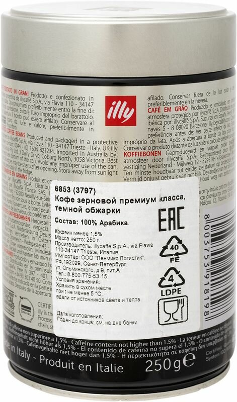 Кофе illy зерновой, темной обжарки, банка 250 г
